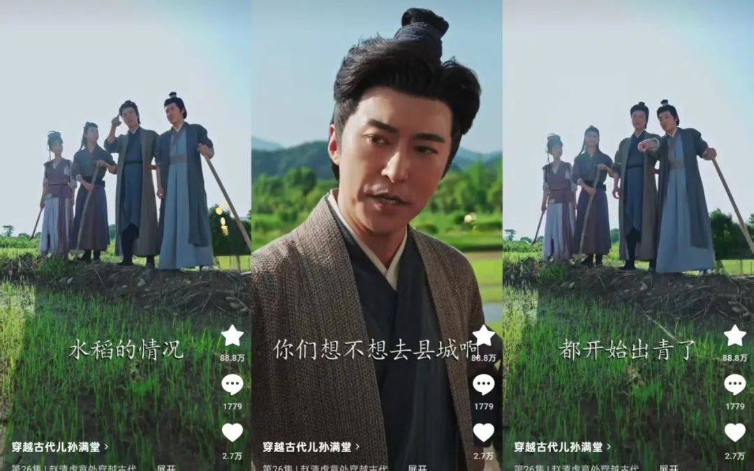 微短剧中的明星脸不少,《一品布衣》有“短剧版胡歌”,《穿越古代儿孙满堂》就有“短剧版靳东”。同样是种田文,女频种田文突出岁月静好和家长里短,男频种田文则真的在耕田。