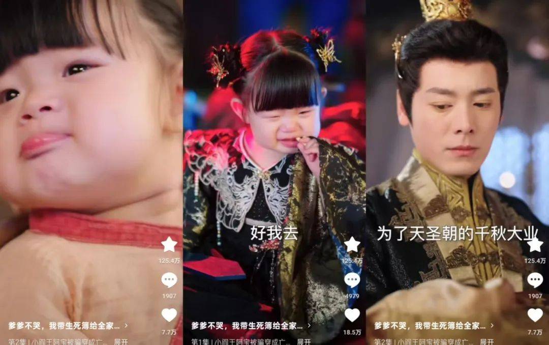 其中饰演阿宝的2岁小萌宝甜豆,也是《穿书之炮灰变身天道亲闺女》的主演,这部剧曾在5月达到10亿+播放量,也是萌娃赛道最受瞩目的短剧之一。甜豆可以说是史上年纪最小的流量演员。