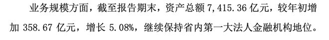 截至报告期末,贵阳银行的资产总额7,415.36亿元,较年初增加358.67亿元,增长5.08%,继续保持省内第一人金融机构地位。