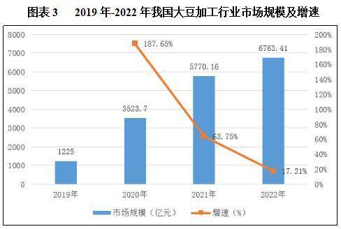 随着中国人口的增长和消费者健康意识的提高,对高品质、高附加值的大豆加工产品的需求不断增加。这促使大豆加工企业不断升级产品结构,提高产品质量。近年来,中国大豆加工行业市场规模持续扩大。根据和仕咨询集团数据显示,2019年我国大豆加工行业市场规模达1225亿元,同比上年增长6.5%;2020年我国大豆加工行业取得了显著的增长,市场规模为3523.7亿元,同比增长了187.65%;我国大豆加工行业在2021年市场规模达到了5770.16亿元,同比增长了63.75%。2022年我国大豆加工行业市场规模6763.41亿元,同比增长了17.21%,其中豆制品市场规模1222.25亿元,豆油市场规模1762.55亿元,其他加工产品规模51.58亿元。这种增长趋势在2022年及以后仍将持续,尤其是随着人口增长、消费升级和国内外市场需求的增加,大豆加工行业市场规模有望进一步扩大。